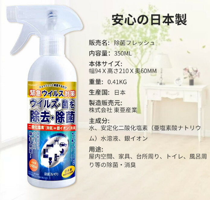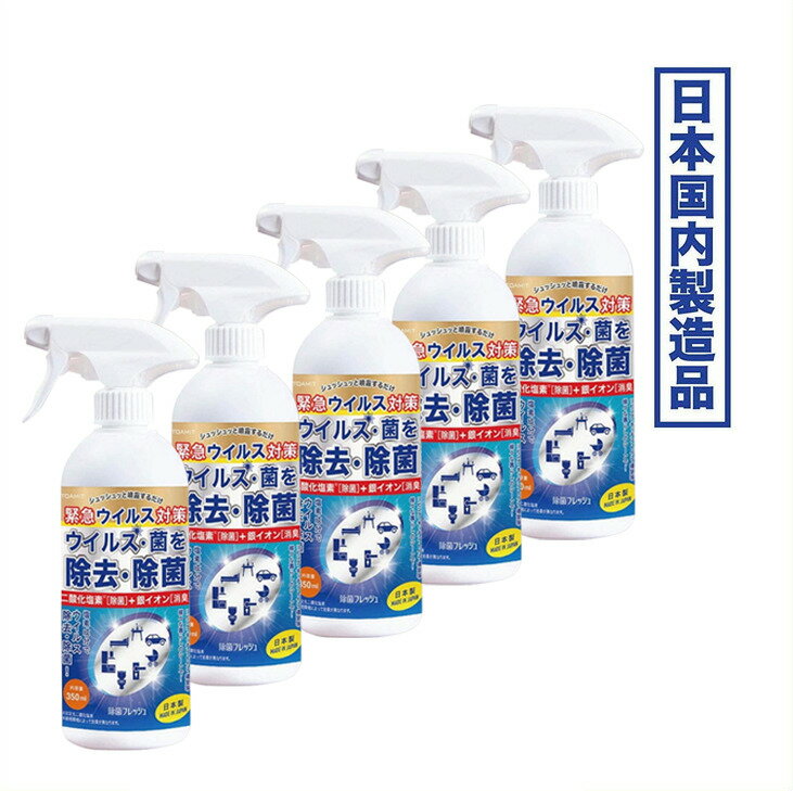【4月25日から順次発送】【5本セット】日本製 除菌フレッシュ 350ml 二酸化塩素+銀イオンのパワー ノンアルコール 【送料無料】【日本から出荷】 【商品仕様】商品名:除菌フレッシュ(5本セット)生産地:日本成分:二酸化塩素水溶液(亜塩素酸ナトリウム)、銀イオン内容量:350mL(1本あたり)本体サイズ:約幅60×高さ211×奥行60mm本体重量:約0.41kg(410g)二酸化塩素×銀イオンのパワーでウイルス・菌を除去・除菌気になる屋内の空間や場所にシュッシュッと噴霧するだけで、二酸化塩素と銀イオン(Ag)のパワーが除菌・消臭作用を発揮して、玄関周りやお部屋の空間はもちろん、キッチン周りやトイレ、浴室などもリフレッシュ!ドアノブ、手すり、テーブル、イスなどにも「除菌フレッシュ」で菌やウイルス、臭いを除菌消臭します!いろいろ気になるこの季節、除菌フレッシュで清潔空間をさぽーとします。